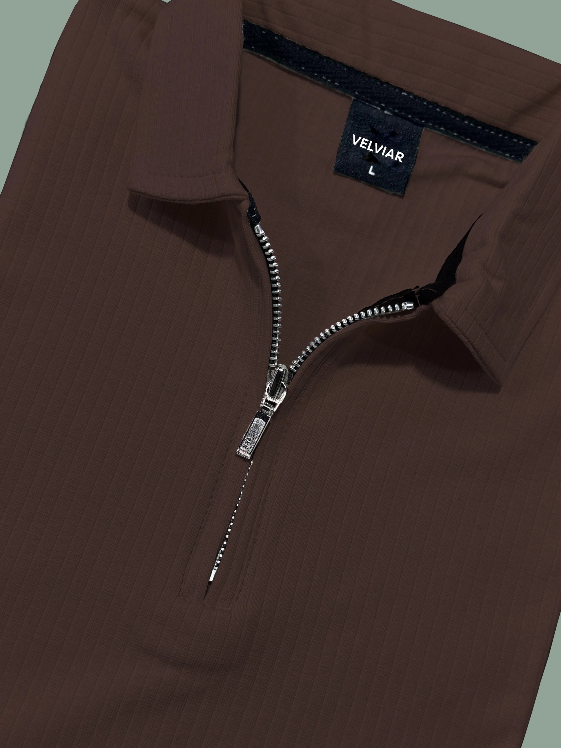Knit Zip Brown Polo Shirt & White Drawstring Trouser