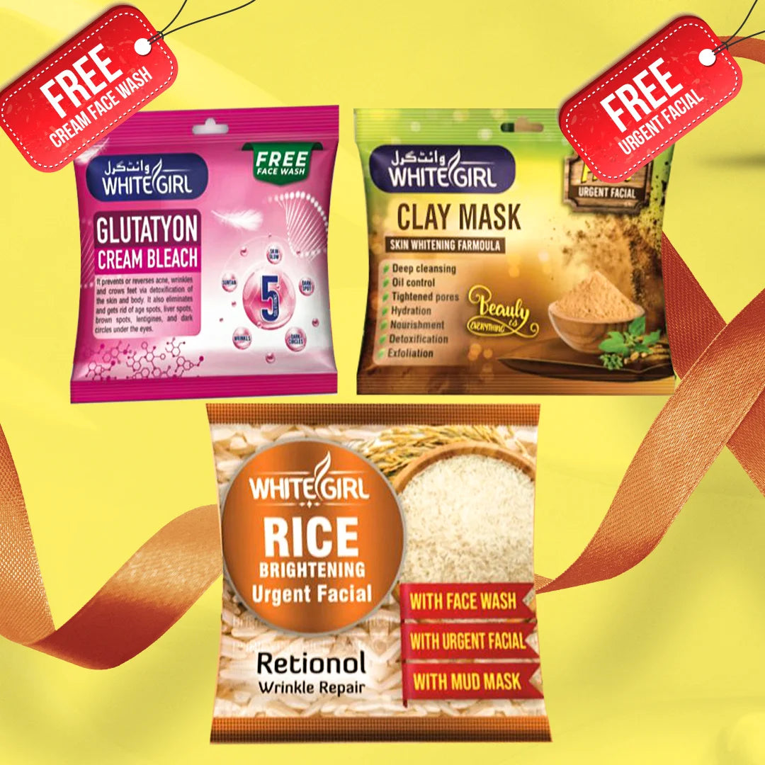 The White Girl Brightening Facial Trio is a powerful 3-step glow system featuring Glutathione Cream Bleach, a Deep Cleansing Clay Mask, and the Rice Brightening Urgent Facial. Designed to lighten dark spots, cleanse pores, control oil, and deliver an instant fresh glow, this combo nourishes and revitalizes dull skin. Each pack includes FREE Cream Face Wash, FREE Urgent Facial, and FREE Mud Mask for enhanced skincare results.